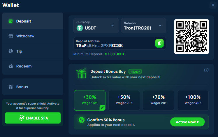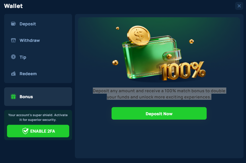 - 100% Match: For every 1 USDT / BTC / ETH etc. you deposit, you receive 1 bonus coin (.b). Example: Deposit $500 → $500 real + $500 bonus coins = $1,000 total to play with.